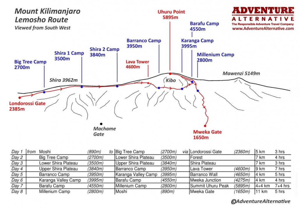 The 7 day Machame route is £1895 and people often ask why is it £100 cheaper than the 7 day Lemosho – the reason is additional transport costs for the team, staff and kit to start point of the Lemosho route plus there’s additional fees per person for transiting the forest to reach the start point.